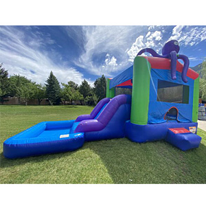 Bounce! Slide! Splash! Shoot hoops! The kids will have a splash going down the double wide slide into the pool. The bounce has an indoor basketball hoop for additional fun!
